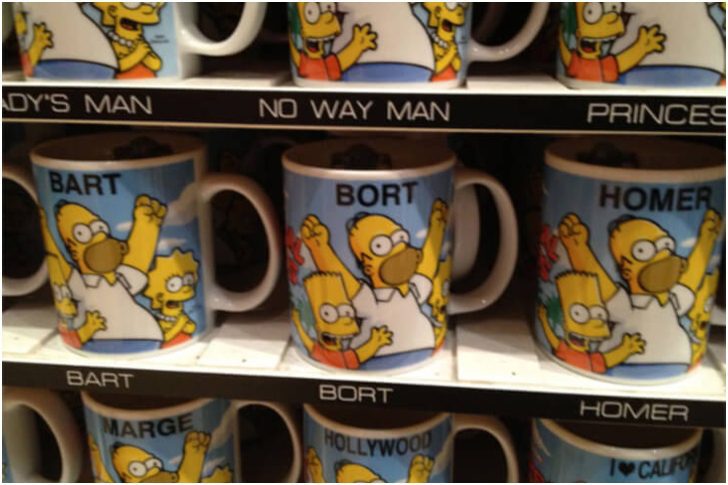 In this supermarket photo, mugs featuring Bart Simpson and his family are on display. Hilariously, one of the mugs reads “Bort” instead of “Bart.” This funny mistake references a classic episode of “The Simpsons” where Bart finds personalized merchandise named “Bort,” sparking a running gag among fans.