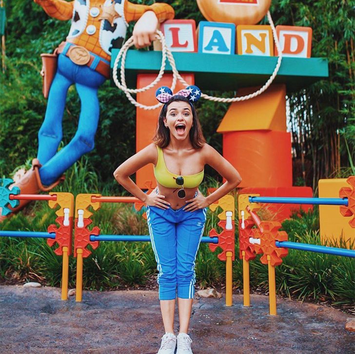 Woody, the beloved cowboy from “Toy Story,” is famous for his loyalty and catchphrase, “There’s a snake in my boot!” The girl’s mustard yellow crop top perfectly complements the colorful background, making her look like she belongs in Andy’s toy box, adding a patriotic flair to the fun.