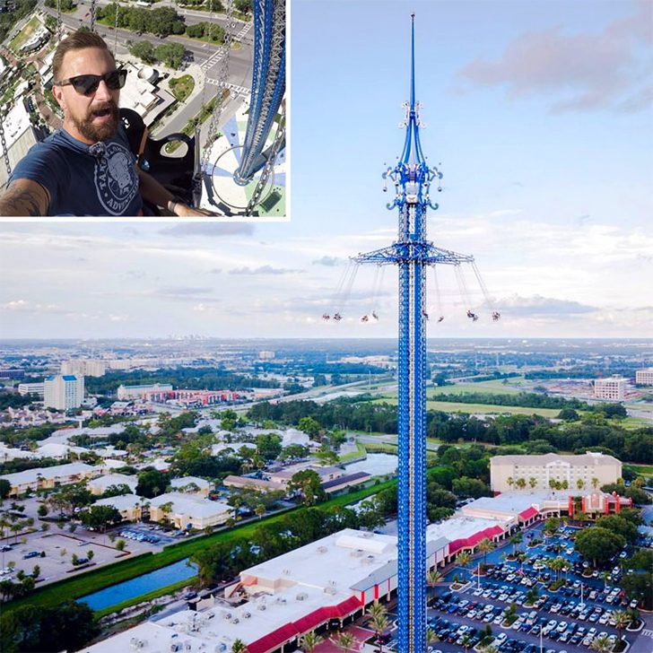 This photo shows a man taking a cool selfie on Orlando’s tallest swing ride, the Starflyer. This thrilling ride lifts passengers 450 feet into the air, spinning them around while offering breathtaking views of the city below.