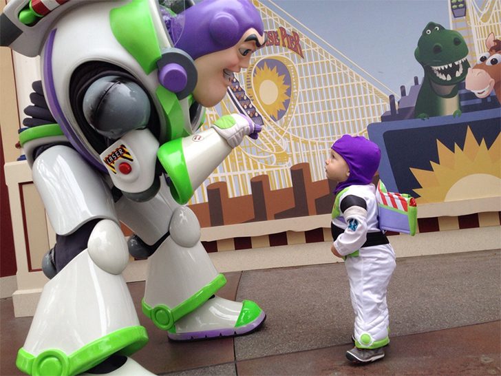 A little boy dressed as Buzz Lightyear meets the real Buzz at an amusement park. Buzz Lightyear, the heroic space ranger from “Toy Story,” is known for his catchphrase, “To infinity and beyond!” and his adventurous spirit.
