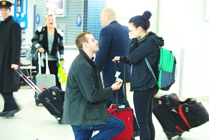 Ein Heiratsantrag ist einer der emotionalsten Momente im Leben eines Paares und dieser junge Mann machte ihn mitten in der Ankunftshalle des Flughafens. Vor den Augen neugieriger Passagiere kniete er nieder, während seine Partnerin sichtlich überrascht reagierte. Ihr Gesichtsausdruck zeigt, dass sie höchstwahrscheinlich “Ja” gesagt hat.
