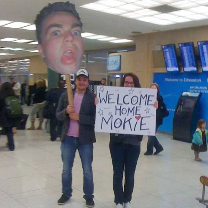 Manche Begrüßungen am Flughafen bleiben für immer im Gedächtnis und Mokies Familie wusste genau, wie man das erreicht. Während viele mit einfachen Schildern auf ihre Liebsten warten, hatten sie eine bessere Idee. Sie druckten ein riesiges Foto von seinem Gesicht aus, auf dem er eine lustige Grimasse zog und schrieben auf ein zweites Schild die Worte: “Willkommen zu Hause, Mokie”.