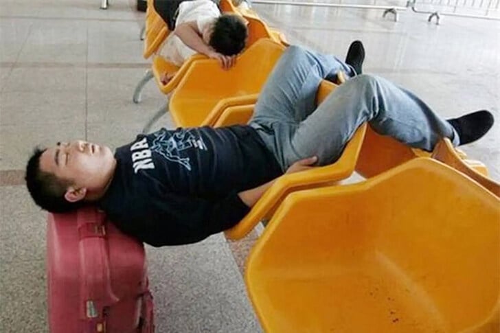 Diese Art von Improvisation ist am Flughafen keine Seltenheit, da viele Sitzmöglichkeiten unbequem sind und Reisende oft stundenlang auf Anschlussflüge warten müssen. Während manche mit Nackenkissen und Schlafmasken ausgerüstet sind, beweist dieser Mann, dass man mit ein bisschen Kreativität selbst die unbequemste Umgebung für eine Runde Schlaf ausnutzen kann.
