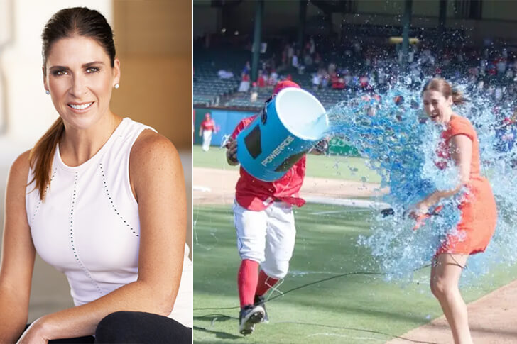In 2016, following the Rangers’ impressive 6-2 victory against the Red Sox, second baseman Rougned Odor surprised Emily by dousing her with a jug of Powerade. Initially attempting to shield herself with a string, she soon realized her efforts were futile, accepting her fate and displaying good sportsmanship.