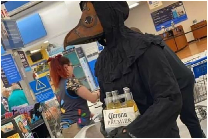 Now this is a sight we do not see often. Shortage of drinks at a costume party, we assume? Although not quite sure what kind of costume party they are having…bubonic plague themed, most probably. Or it could just be that people are simply getting more creative in their protection against the fast-spreading pandemic. Either way, props to this guy for treating the pandemic as great excuse to dress up.