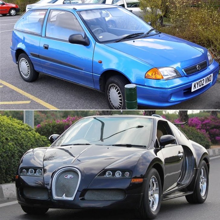 Driving the powerful Bugatti Veyron, you can reach up to 254 mph and push more than 1,000 bhp. Only 450 of these luxury cars have been made, costing $1 million to $2 million, so they are typically owned by the wealthy. But there are people who cannot afford it but desperately want to own one, so they choose replicas. This one, made by India’s SF Carz, used a Suzuki Swift car as the base vehicle. Now, it didn’t have the 1,000 bhp or the W16 engine of a Bugatti, and in reality, it was an 85 bhp, 1.3-liter older Suzuki. Even the 2017 Swifts have 93 bhp, and in 12.3 seconds, can move from 0 to 62 mph.