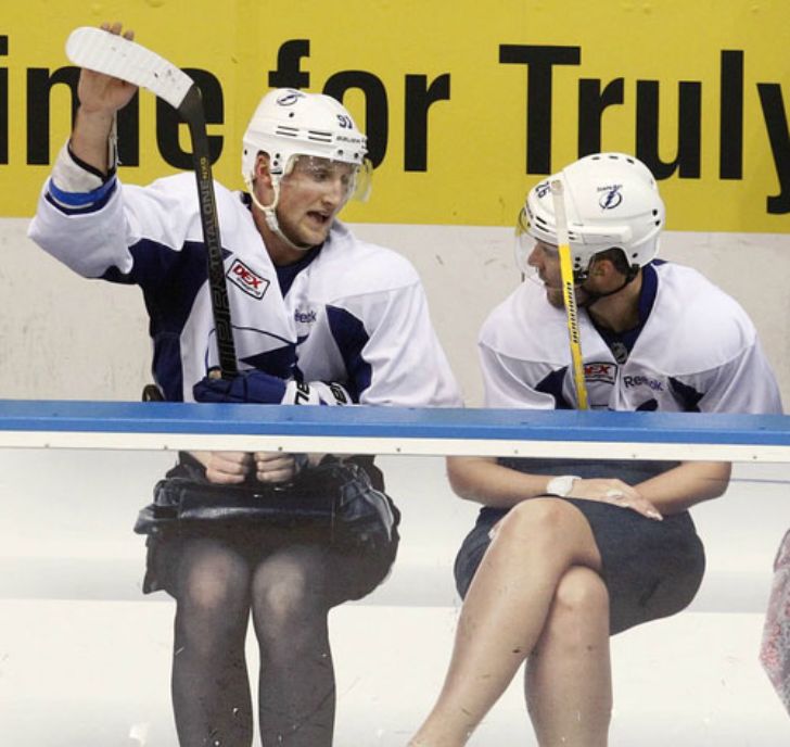 This bench shot has all the elements of hockey professionalism—with a side of unexpected style. One player is focused on explaining a critical play, completely unaware of how fabulously he’s rocking a pair of pantyhose. The other teammate is listening intently also unaware that he’s sitting like a diva.