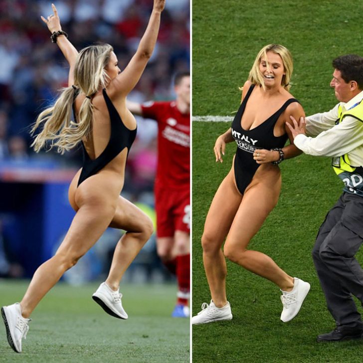 Kinsey Wolanski turned the pitch into her runway at the UEFA Champions League with a swimsuit advertising her boyfriend’s X-rated site. She’s giving a whole new meaning to “stealing the spotlight,” distracting the crowd from the showdown between Liverpool and Tottenham.