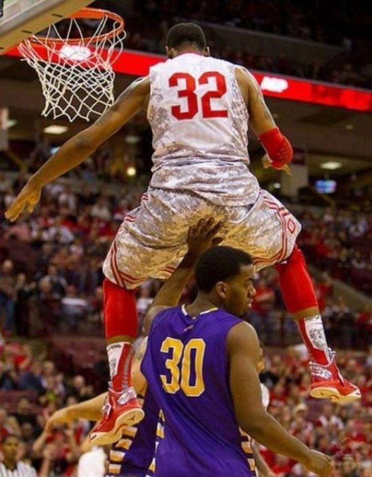This mid-game moment looks less like basketball and more like an accidental piggyback ride gone wrong. Player 32 seems fully committed to the slam dunk, but player 30 probably didn’t sign up to be part of the assist. The guy on the bottom must be thinking, “Why me?” while carrying more than just the weight of his team.