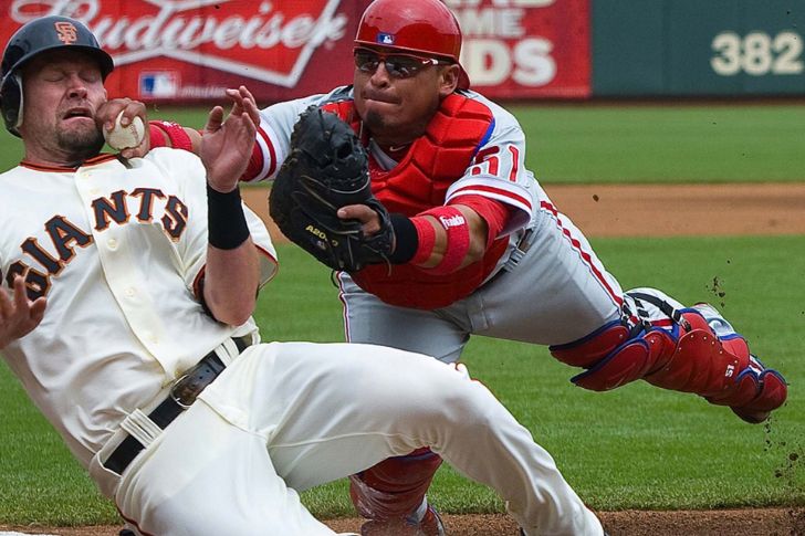 This play turned into a real-life crash course in trust issues. Phillies catcher Carlos Ruiz seems determined to save the day and the ball, but the Giants player Aubrey Huff looks less than thrilled to be part of the rescue mission. That baseball floating mid-air is the silent instigator of all this chaos.