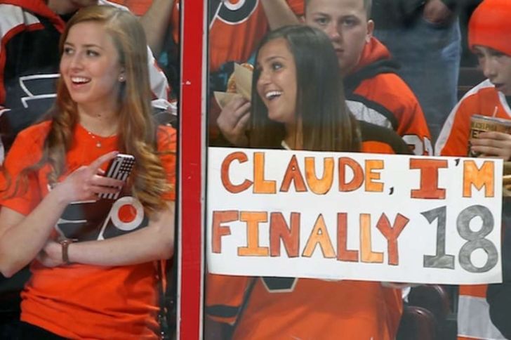 This fan didn’t hold back when it came to grabbing Claude Giroux’s attention during his time with the Philadelphia Flyers—talk about a bold play. She’s holding her big birthday announcement front and center because turning 18 is a big deal. And that glass separator isn’t going to stop this declaration of devotion.