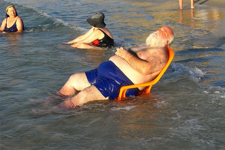 Sometimes, the beach isn’t about running around or diving into waves—it’s about creating a personal oasis, and this man nailed it. Reclined in his plastic throne with water swirling around him, he’s channeling ultimate relaxation while others splash and struggle to stay upright. It’s like he invited the tide to be his masseuse, and it accepted.