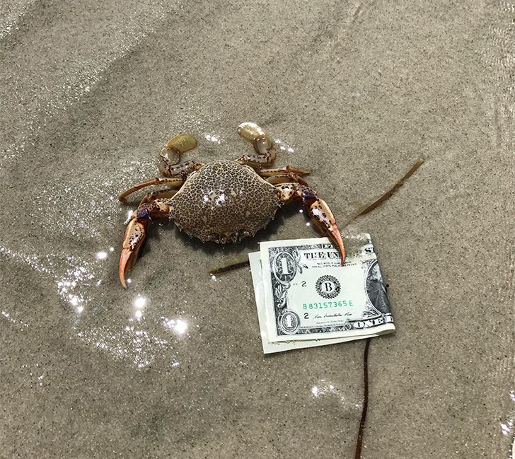 From the look of things, this crab is ready to upgrade its tidepool digs. Who needs buried treasure when you can casually carry cash around like a coastal boss? It’s a perfect example of nature’s comedic timing meeting human curiosity, all wrapped up in one hilarious seaside picture.
