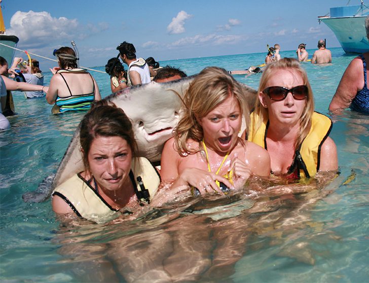 Let’s be real, though—the poor ray’s face says, “I didn’t sign up for this.” Meanwhile, the girls Have looks of terror on their faces. The mastermind behind this scene, whose head peeks out, probably thought he was a comedic genius. Instead, he’s just as baffled as everyone else. This might be the first case of a stingray getting photo-shy!