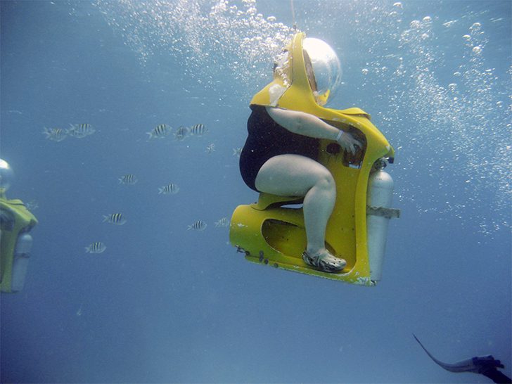 Surrounded by curious fish and calm waters, the vibe is part explorer, part underwater joyride. The whole setup feels like something out of a sci-fi comedy, where the sea becomes your road and the fish your traffic companions. Forget walking on the beach—this is how you make waves in style.