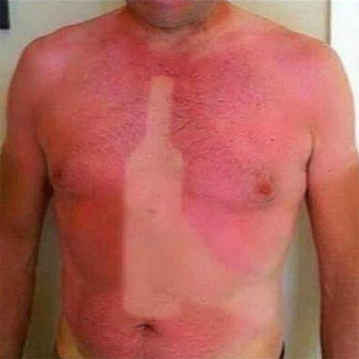 It seems this man achieved the ultimate bottle-shaped sunscreen ad—without the sunscreen. A bold nap under the blazing sun and a conveniently placed bottle created a masterpiece of unintentional sunburn art. While the chest is fiery red, the pale imprint of the bottle screams, “This could’ve been avoided.” Who needs a tattoo when the sun can brand you instead?