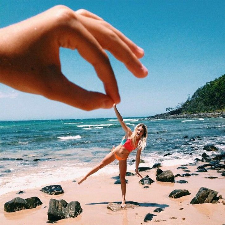 Forget ordinary beach photos—this one feels straight out of a fairy tale, with a twist. The cleverly placed hand transforms her into a human action figure being casually plucked up by some beachside giant. Between the playful pose and the flawless timing, it’s hard not to laugh and wonder if this was planned or just a hilarious accident.
