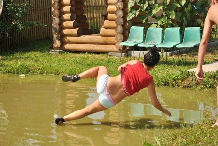 This isn’t just a fall—it’s a performance. With one leg reaching for the sky and an arm outstretched for balance that never stood a chance, she’s a split second away from becoming one with the pond. Somewhere between ballet and belly flop, this moment captures the exact point where fun meets chaos.