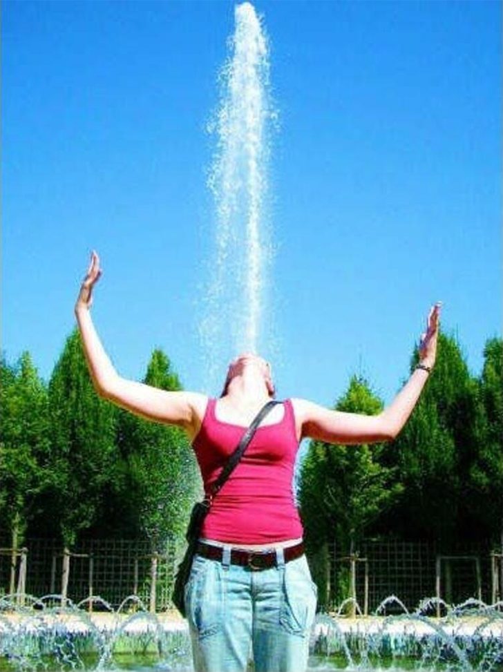 She seems to have mastered the ultimate summer trick—becoming a human fountain. Perfectly positioned by the jets, it almost looks like she is the star attraction of a quirky water park. The sheer precision of this shot is enough to make anyone double-take and question her secret to such a spectacular “performance.”