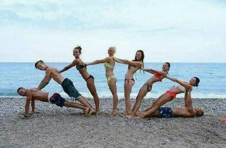 The unsung hero here is the guy lying flat, carrying the weight of everyone’s summer ambitions and probably regretting it! Let’s not forget the balance and core strength required to pull this off—or the sheer number of faceplants it likely took to get it right. This isn’t just a pose; it’s a sand-covered act of teamwork legend.