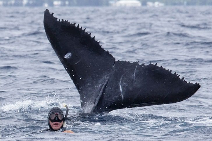 This person might have signed up for a casual snorkeling session, but Mother Nature had other plans. Just behind them, a massive whale tail emerges like a scene straight out of an action movie. The expression says it all—half thrill, half “am I part of the food chain now?”
