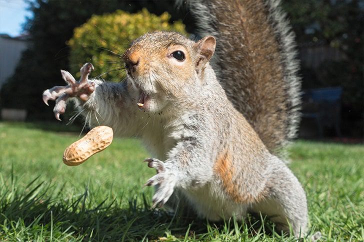 This squirrel has reached peak drama as it lunges for the peanut with the intensity of a blockbuster action scene. Its little paws are outstretched, its eyes locked in sheer determination, and that slightly open mouth screams, “Mine!” It’s as if the peanut represents the last snack on Earth, and this squirrel isn’t leaving anything to chance.