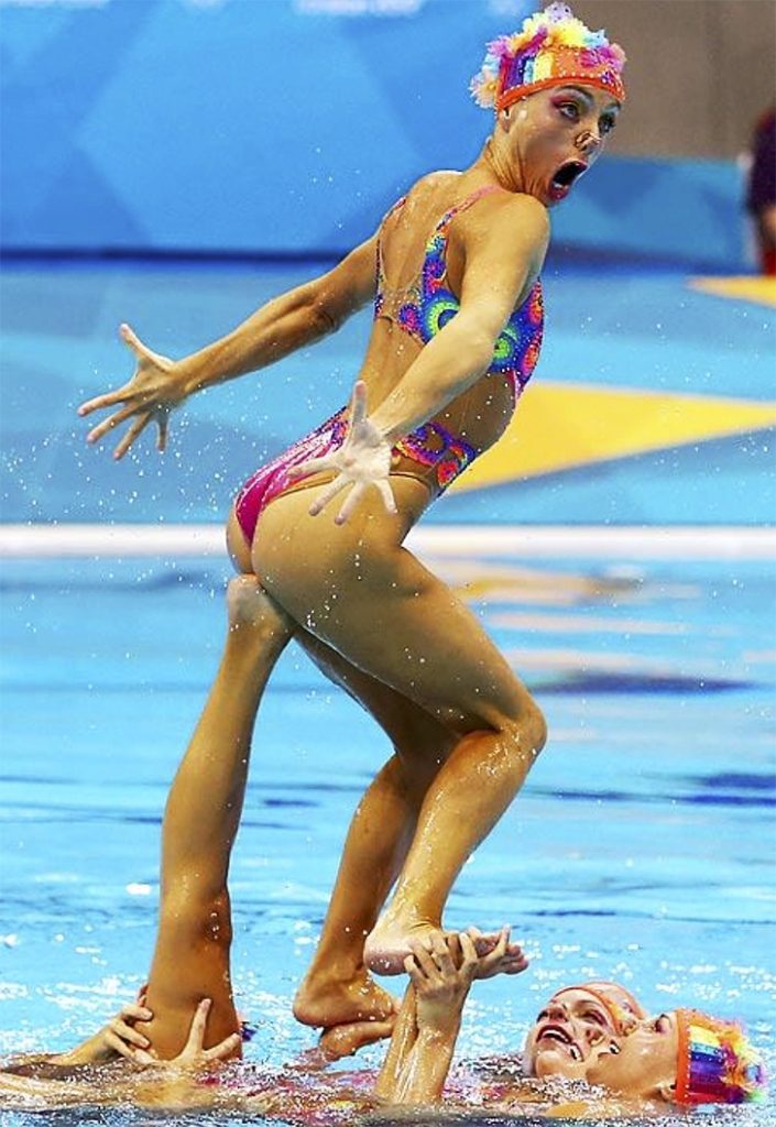 The bright, psychedelic swimsuits and perfectly aligned choreography make this photo a visual treat. Yet, it’s hard not to chuckle at the mix of intensity and elegance on display. Whatever the intended move was, it’s clear this moment was all about making waves—both in the water and with the audience.
