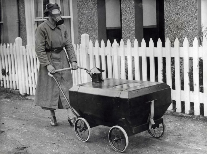The gas mask pram – as shown here – was a terrifying-looking contraption, but it was guaranteed to keep babies safe in the event of an attack. The government even held regular drills with tear gas, so nobody felt in any way unprepared should the worst happen.