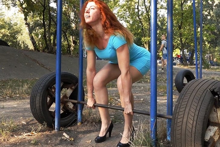 Im Outdoor-Gym sorgt diese rothaarige Lady für Aufsehen – und das nicht unbedingt wegen ihrer Gewichte. In High Heels und einem Cocktailkleid, das eigentlich eher zu einer Party als ins Gym passt, hebt sie Hanteln wie ein Profi. Die Blicke der Umstehenden? Zwischen Verwunderung und Bewunderung.