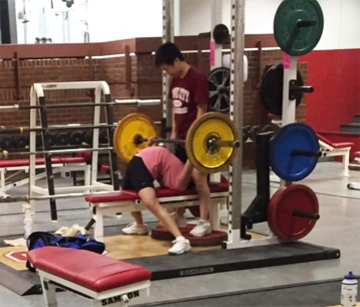 Stellt euch vor, ihr trainiert nichtsahnend im Fitnessstudio und dann seht ihr plötzlich dieses Chaos: Ein Mann versucht verzweifelt, eine Hantelstange zu stemmen, während sein “Helfer” über ihm steht und scheinbar versucht, ihn mit den Beinen zu würgen. Das Ganze sieht weniger nach Training aus als mehr nach einem missglückten Wrestling-Move.