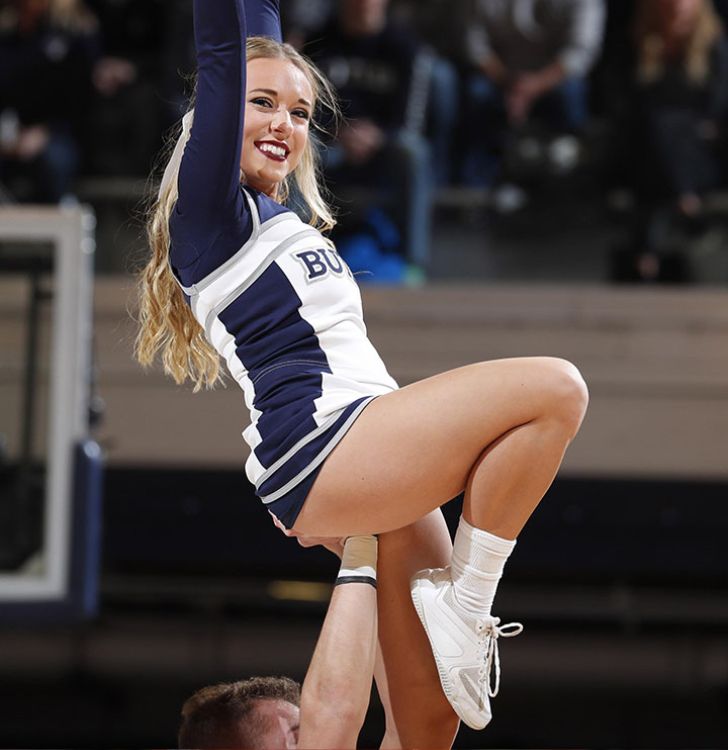 Auf den ersten Blick scheint dieses Bild eine perfekte Cheerleading-Performance zu zeigen, denn die strahlende Cheerleaderin hebt ihre Hände in die Luft und lächelt, als wäre die Hebeübung reibungslos gelungen. Doch wer genauer hinsieht, kann erkennen, dass nicht alles nach Plan lief. Die Hand ihres Partners, der sie nicht nur hochhält, sondern auch für ihre Sicherheit verantwortlich ist, scheint in einer eher unvorteilhaften Position gelandet zu sein.