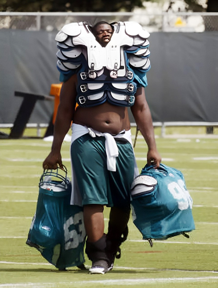 Dieser Team-Assistent verdient eine Auszeichnung und zwar für seine kreative Effizienz. Statt mehrmals hin und her zu laufen, bringt er sämtliche Ausrüstungsgegenstände auf einmal auf das Spielfeld. Mit mehreren Schulter- und Brustschonern über dem Körper und Trikots, die wie Tragetaschen für Helme und Zubehör dienen, hat er eine wahrhaft originelle Lösung gefunden.