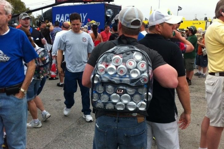 Sportevents sind bekannt für ihre strikten Regeln, die eingehalten werden müssen. Dieser Fan, der sich gut auf das Rennen vorbereitet hat, hält sich daran und hat einen durchsichtigen Rucksack dabei. Das einzige, was er für das Rennen zu brauchen scheint, um einen tollen Tag zu haben, ist viel Bier.