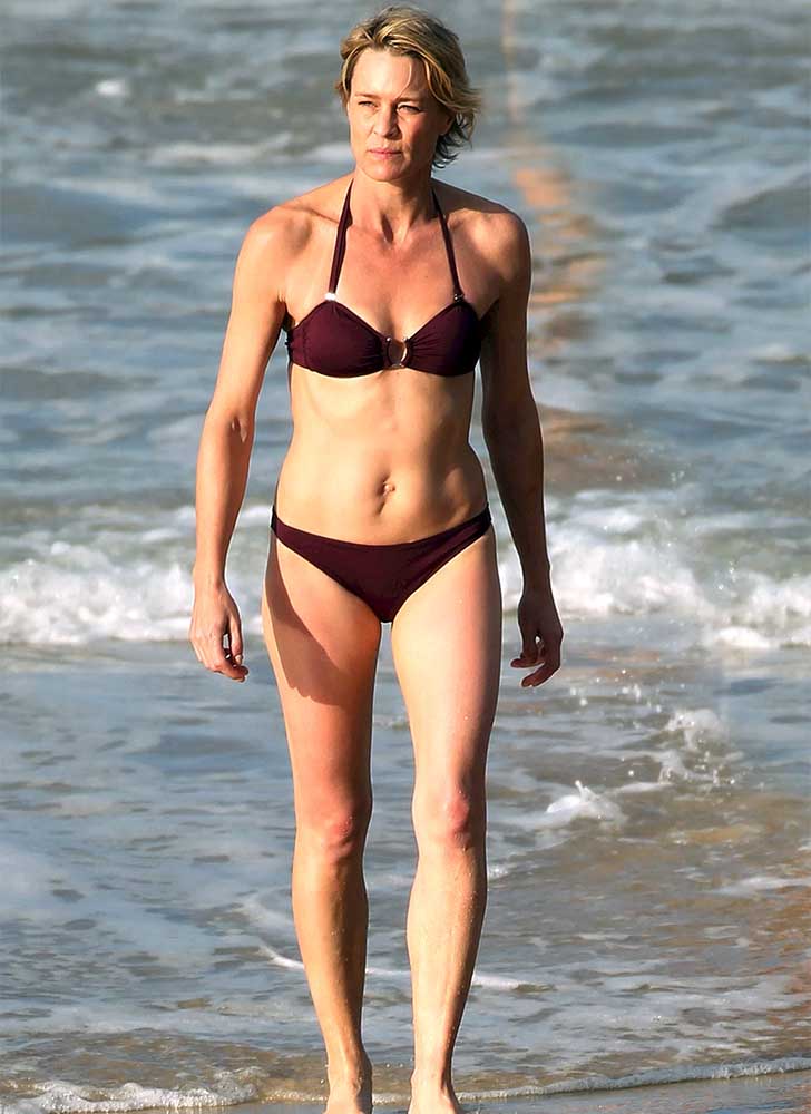 Indeed, age is just a number when it comes to rocking a bikini, thanks to Robin Wright. With her fierce portrayal of Claire Underwood in “House of Cards,” she maintains her toned physique with yoga, hiking, and strength training. Her diet focuses on fresh, organic foods, with an emphasis on lean proteins and vegetables.