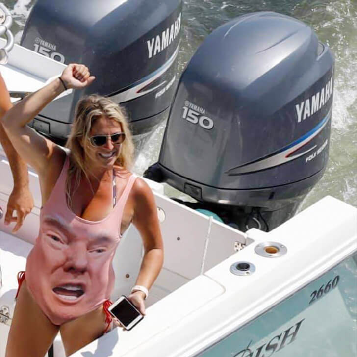 Some folks wear their opinions on their sleeves, while others take it a step further with their swimsuits. This lady decided to pair her adventure with a bold fashion statement—sporting an outfit that ensures no one misses her allegiance to her president. Add a sun-kissed grin and sunglasses, and she’s ready to turn heads faster than those Yamaha engines behind her.