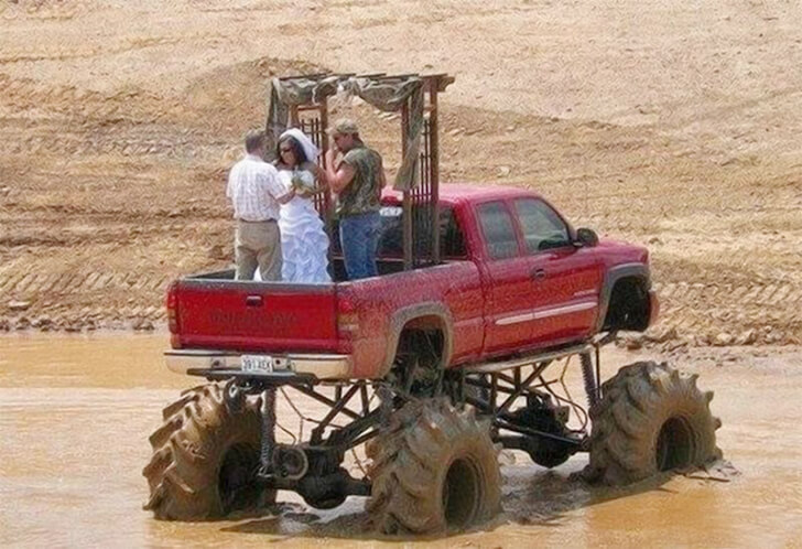 Forget the chapel; this is where the magic happens for any truck lover. Who needs fancy flowers and overpriced venues when you’ve got a truck that doubles as your altar? You can practically hear the sound of the engine revving as they seal their love literally and figuratively.