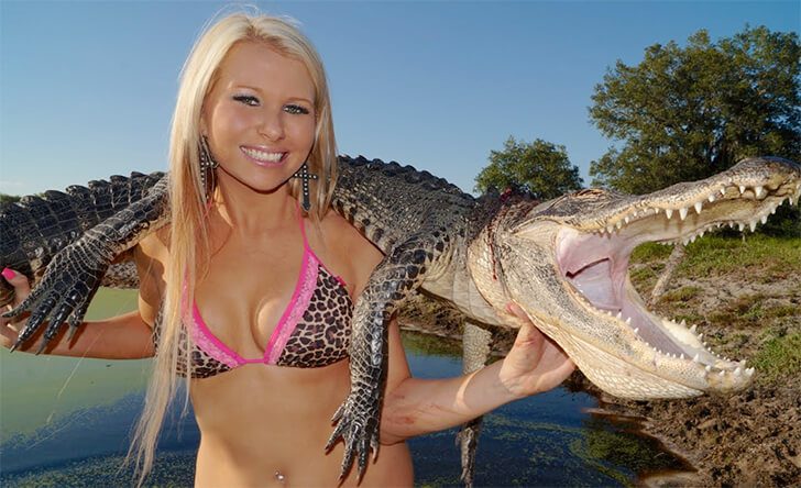 Nothing screams, “I’ve got this,” like casually balancing a gator on your shoulder while sporting a bright smile. This fearless woman might look like she’s just posing, but the alligator clearly has some feelings about being part of the action, giving us its best wide-mouthed display.