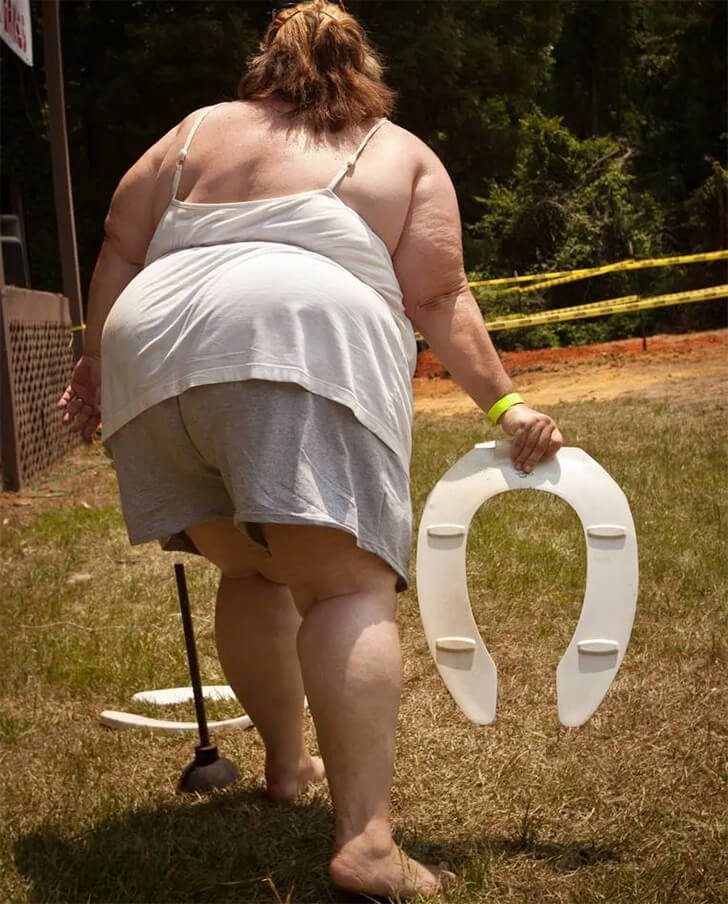 Forget traditional games—this twist on horseshoes takes the cake for creativity. With a firm grip on a toilet seat, this lady is ready to show everyone how backyard competition is really done. It’s the kind of event where rules are optional, but laughter is guaranteed, and she’s embracing the spirit of fun.