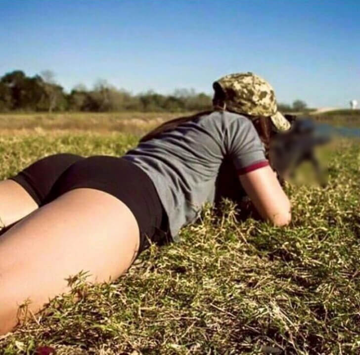 Here’s a scene where precision meets the great outdoors. With her camouflage cap and a keen eye on the target, this sharpshooter is ready to showcase her skill. But let’s be real—her attire seems to have shifted our targets and stolen the spotlight, especially with the rifle being out of focus.