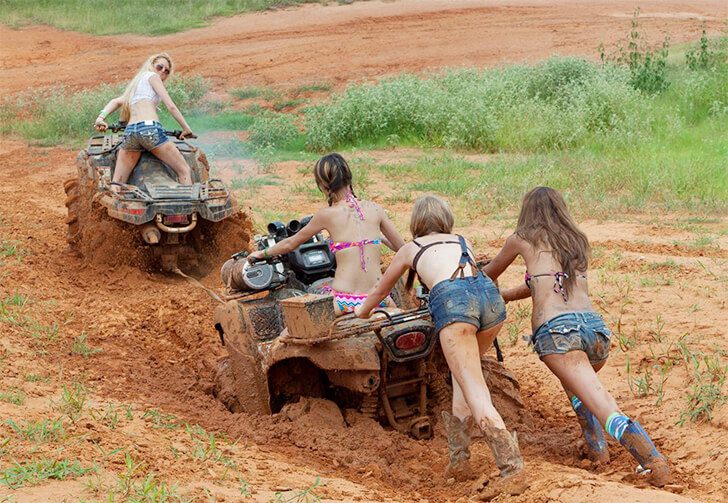 Here’s what true grit looks like. Three ladies are giving it their all to free a stuck quad, while the fourth one leans back on her ride with a vibe that says, “Glad that’s not me!” Between the bikini tops, denim shorts, and boots, it’s clear that they are more about action than staying clean.