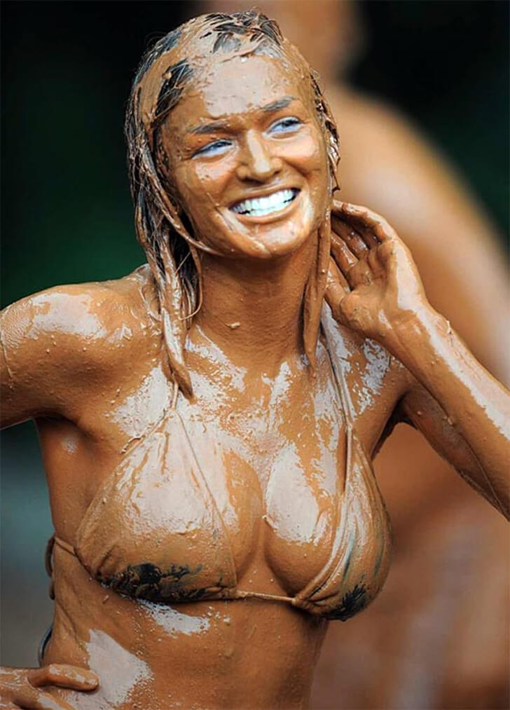 This isn’t your average mud bath but a full-on commitment to a fun, messy style. From her glistening hair to a bikini barely visible under layers of thick, gooey mud, she’s embracing every moment with a big smile. Whether this is for skin care, a contest, or just a wild afternoon, she’s having the time of her life.