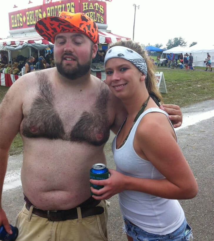 This guy has taken “DIY fashion” to a whole new level, using only chest hair and clippers to craft his unique ‘mankini’ top. Who needs store-bought clothes when creativity like this exists? His orange camo cap only adds to the overall statement, like he’s saying, “Yes, I came prepared to stand out.”