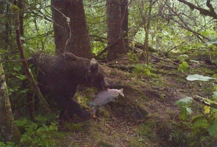 写真に写るのは、魚をくわえたグリズリー。もふもふで可愛いクマですが、次の瞬間には命の危機に繋がる存在です。この光景を目撃したのがトレイルカムで幸いでした。自然の中で遭遇してしまったら、距離を保つことが最優先です。
