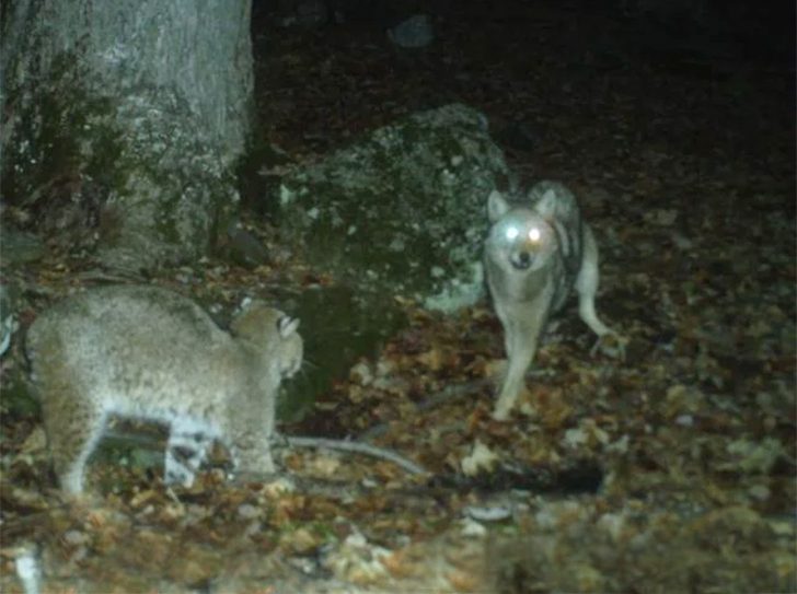 トレイルカムが捉えたのは、まさに対峙するコヨーテと**ボブキャット(ヤマネコ)の2匹。緊張の一瞬がカメラのフラッシュで中断されました。研究によると、コヨーテはボブキャットを“縄張りのライバル”**として排除しようとすることがあるそうですが、時には縄張りを共存することもあるといいます。