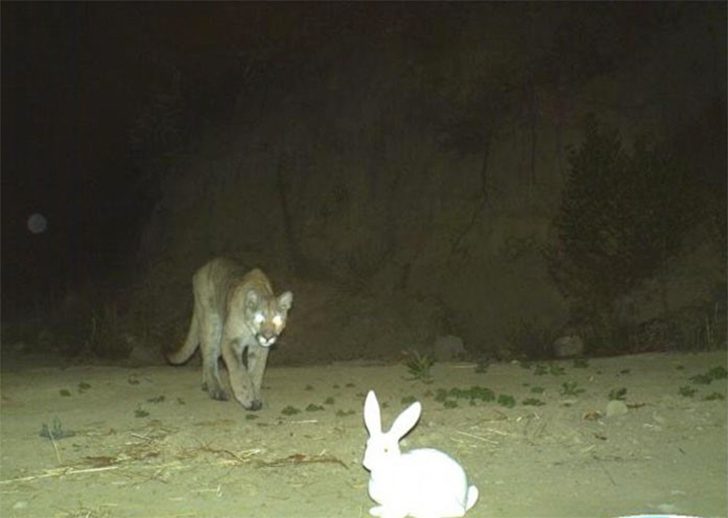 草むらで固まっている1匹のウサギ――その視線の先には山ライオンの影。ウサギは山ライオンの主要な獲物の一つであり、この出会いが悲しい結末に繋がったことは想像に難くありません。