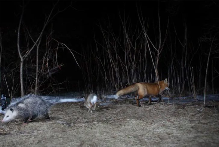 写っていたのは、キツネ、ウサギ、そしてオポッサム──まるで正反対の動物たちの“謎の集会”です。捕食関係にもなりそうなこの組み合わせですが、この夜ばかりは**“チーム”**だったのかもしれません。何かしらのイタズラ大作戦を終えて、家路につくところだったのでしょうか。