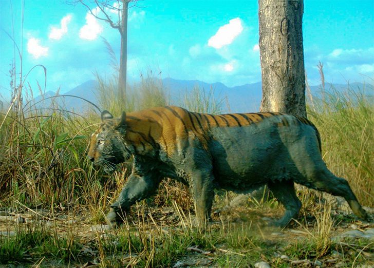 写真のトラは、模様がうっすらとしか見えず、まるで“縞を失ったトラ”のよう。理由は、インド・マナス国立公園で暑さをしのぐために泥風呂に入った直後だったから。泥に浸かることで、見慣れた姿すら変えてしまう自然の中の動物たちの姿です。