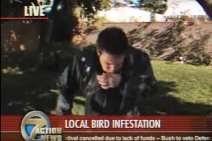 A Canadian journalist found himself in the line of fire while covering a story on the overpopulation crisis of native brown finches. As he stood outside, diligently reporting, an unexpected “oopsie” landed on his shoulder. Startled, he glanced up just in time for another bird, possibly the same mischievous culprit, to deliver an unwelcome surprise—right on his unsuspecting mouth.