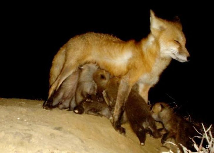 Schau dir diese erschöpfte Fuchsmutter an! Umringt von ihrem lebhaften Wurf steht sie da, mit geschlossenen Augen und sichtlich am Ende ihrer Kräfte. Die kleinen Füchse saugen gierig, während Mama aussieht, als könnte sie jeden Moment einschlafen. Man könnte meinen, die kleinen Energiebündel hätten einen geheimen Strohhalm erfunden, um die letzten Kraftreserven aus Mama herauszusaugen.